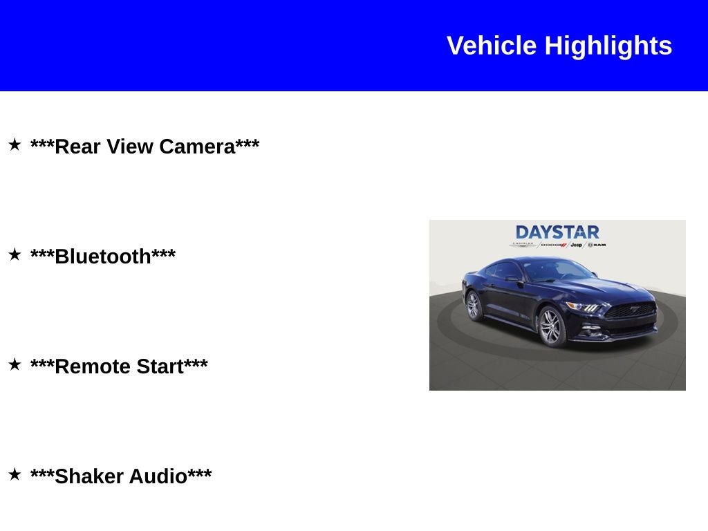 2016 Ford Mustang EcoBoost RWD Odometer is 32373 miles below market average! ***Rear View Camera***, ***Bluetooth®***, ***Remote Start***, ***Shaker Audio***.