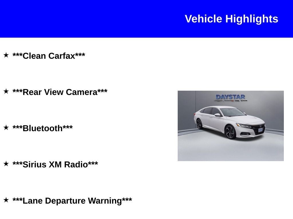 2018 Honda Accord Sport FWD Odometer is 10590 miles below market average! ***Clean Carfax***, ***Rear View Camera***, ***Bluetooth®***, ***Sirius XM Radio***, ***Lane Departure Warning***.