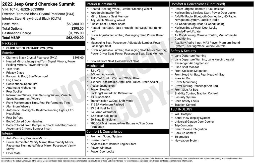 2022 Jeep Grand Cherokee Summit 4WD ***Clean Carfax***, ***One Owner***, ***Heated Steering Wheel***, ***Heated Front Seats***, ***Vented Front Seats***, ***Heated Rear Seats***, ***Blind Spot Monitor***, ***Rear View Camera***, ***Bluetooth®***, ***Sirius XM Radio***, ***Apple Carplay/ Android Auto***, ***Tow Package***, ***Lane Departure Warning***, ***Parallel and Perpendicular ParkAssist with Stop***, ***9 Amplified Speakers with Subwoofer***, *** Nappa Leather Seats ***.