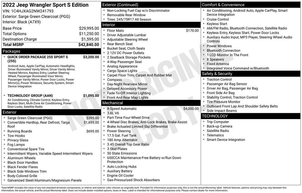 2022 Jeep Wrangler Sport S 4WD ***Clean Carfax***, ***Rear View Camera***, ***Bluetooth®***, ***Sirius XM Radio***, ***Apple Carplay/ Android Auto***, ***Tow Package***.