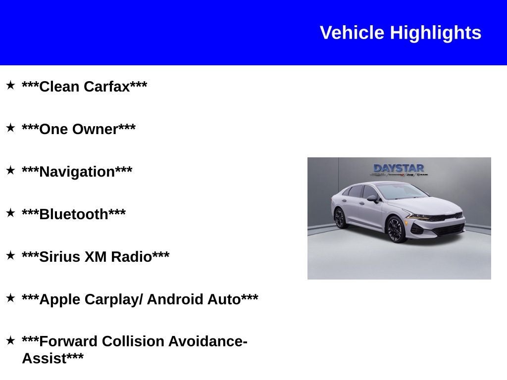 2023 Kia K5 GT-Line FWD ***Clean Carfax***, ***One Owner***, ***Navigation***, ***Bluetooth®***, ***Sirius XM Radio***, ***Apple Carplay/ Android Auto***, ***Forward Collision Avoidance-Assist***, Panoramic Sunroof.